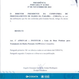 A Companhia de Processamento de Dados da Paraíba – CODATA, editou, em 07 de novembro, a Portaria nº 41/2022, a qual aprova e institui o Guia de Boas Práticas para Tratamento de Dados Pessoais na Companhia, com base na Lei Geral de Proteção de Dados – LGPD.